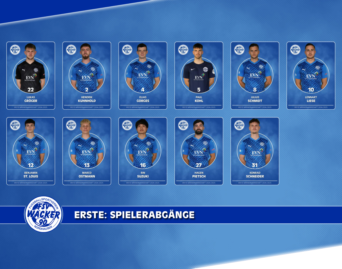 Wir sagen DANKE Lukas, Kuhno, Gorge, Kohle, Jule, Lenny, Ben, Marco, Rin, Hakan und Konny für eure Zeit und euren Einsatz beim FSV Wacker 90 Nordhausen. Wir wünschen euch für eure neuen sportlichen Herausforderungen viel Glück sowie für euren weiteren privaten und sportlichen Werdegang alles erdenklich Gute. Macht’s gut Jungs!