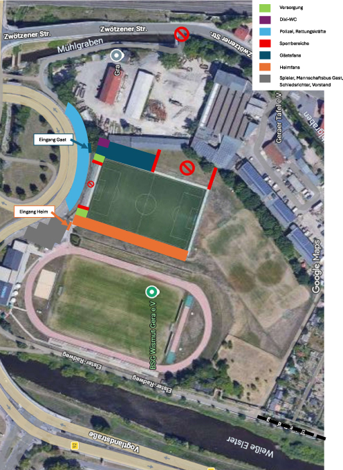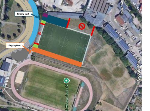 Ihre Fans nutzen bitte ausschließlich den eingezeichneten Eingang. Direkt am Stadion am Steg stehen für Fans keine Parkplätze zur Verfügung. Bei Anreise mit dem PKW bitten wir darum, den Parkplatz „An der Gartenanlage“ zu nutzen. Von dort ist das Stadion fußläufig in etwa 10 Minuten erreichbar.