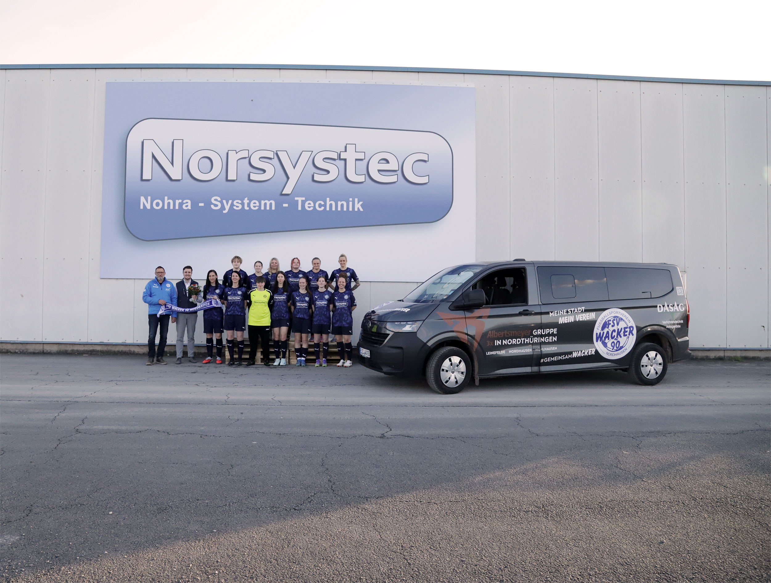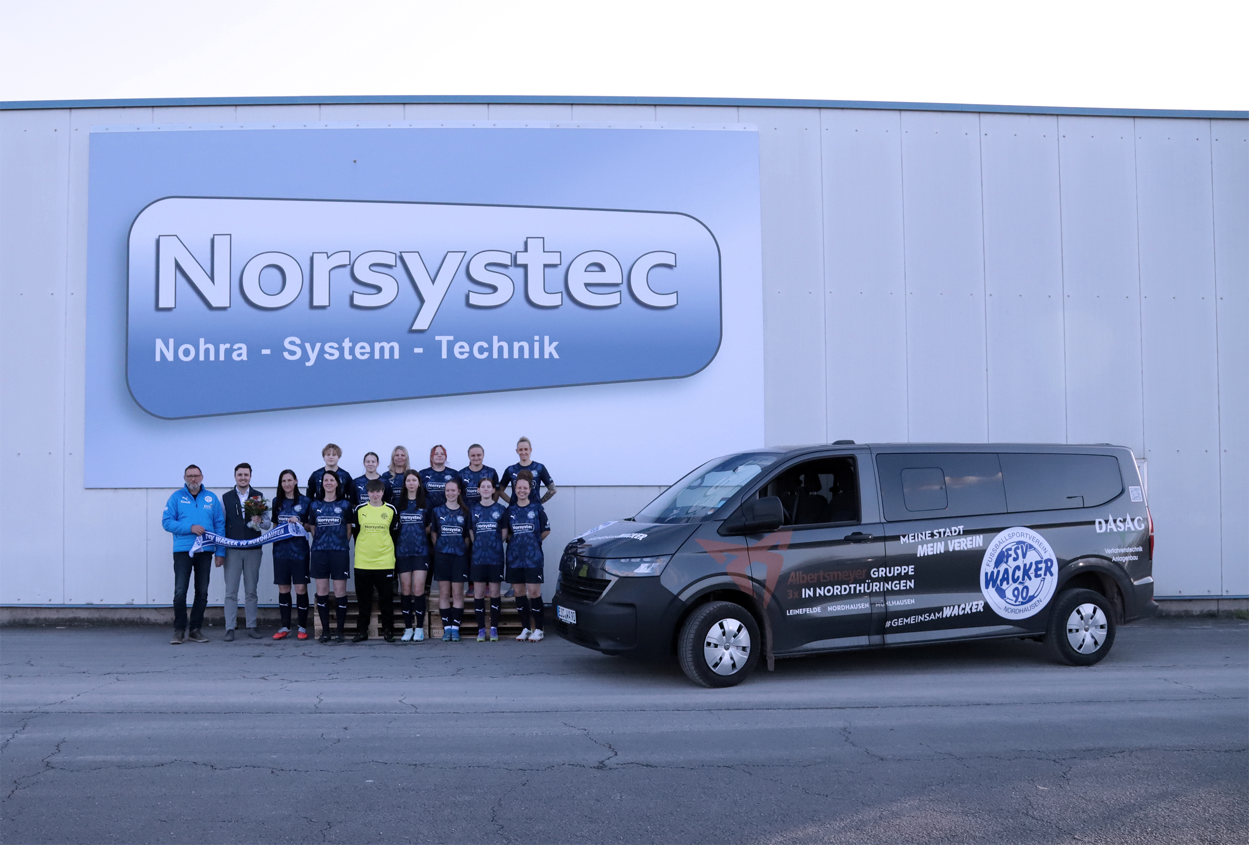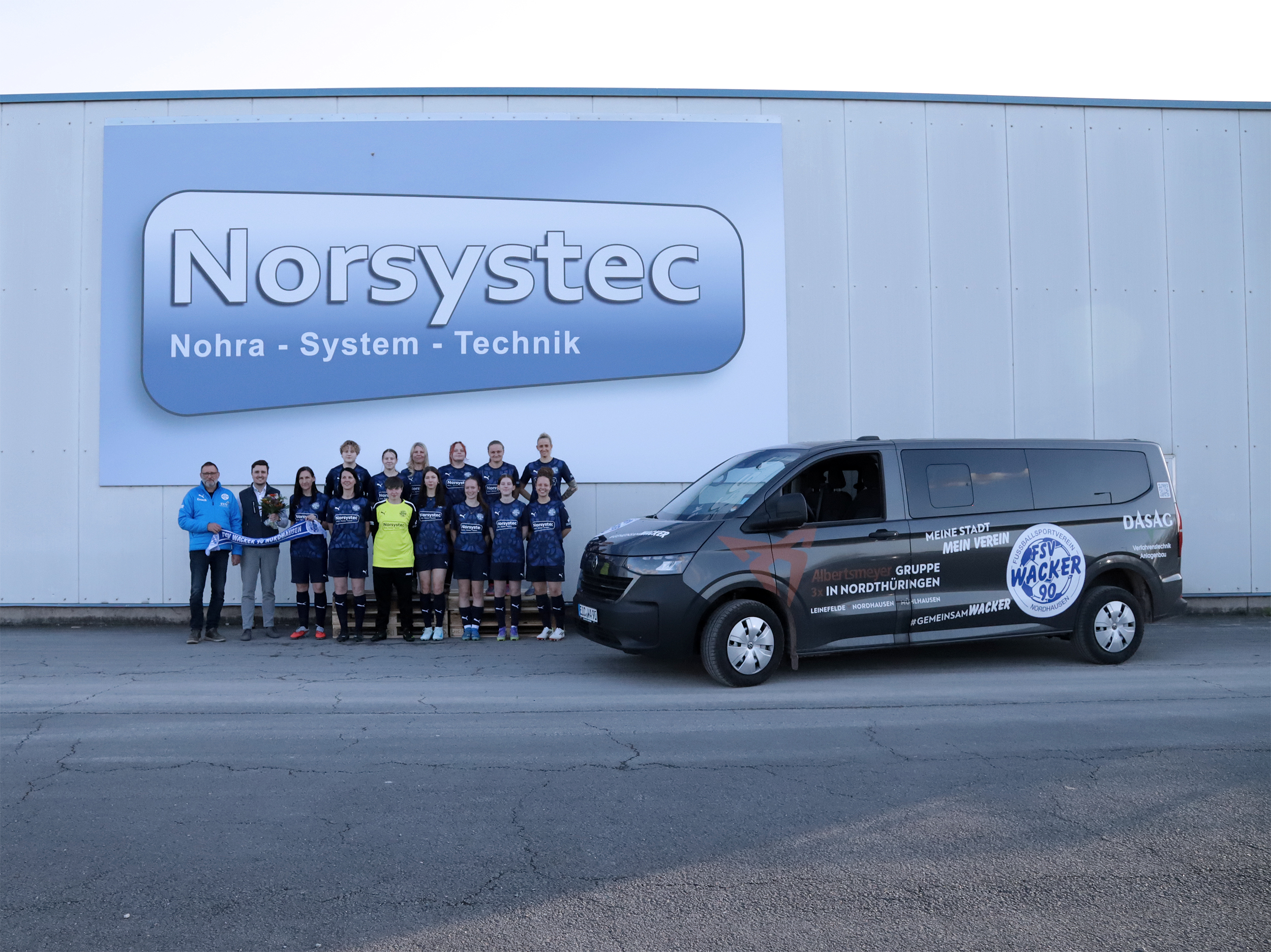 Über einen neuen Trikotsatz der Marke PUMA freuen sich unsere Fußballerinnen. Brustsponsor ist die Firma Norsystec Nohra-System-Technik GmbH mit Sitz in Nohra (Industriegebiet Hünstein). Die Norsystec GmbH stellt unter anderem Kunststoffteile für die Automobilindustrie her. Wiederholte Unterstützung erfuhr unsere Frauenmannschaft durch die Podologiepraxis Petra Seipelt-Bösenberg, die als Ärmelsponsor in Erscheinung tritt. Die offizielle Übergabe des Trikotsatzes inklusive Werksbesichtigung in Nohra fand bereits am 01.04.26 statt.