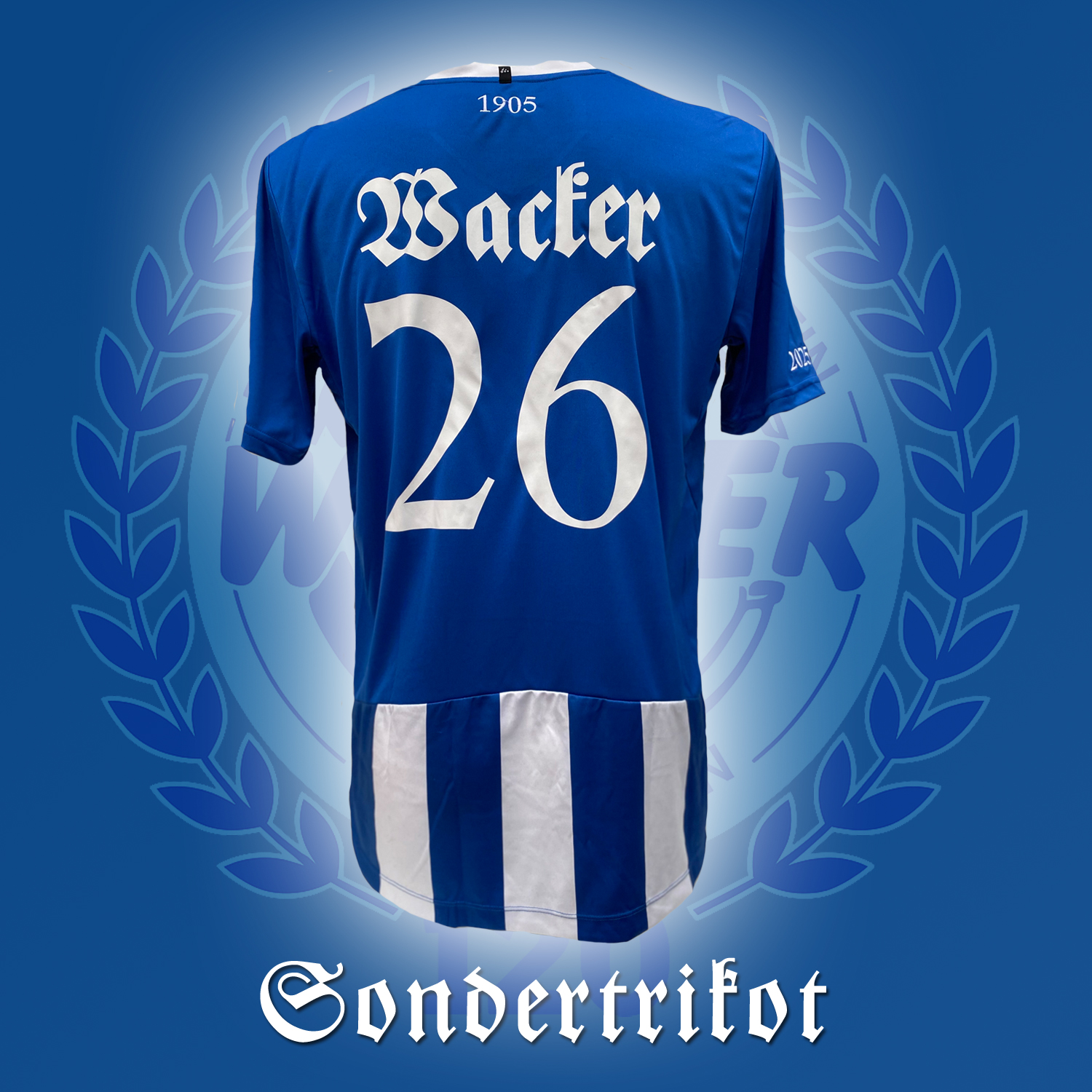 Das Trikot sticht mit einem 3D Traditionslogo, gestickte Jahreszahlen 1905 und 2025 auf den Ärmeln, gestickte Jahreszahl 1905 am Kragen, Name „Wacker“ und Rückennummer in altdeutscher Schrift hervor.