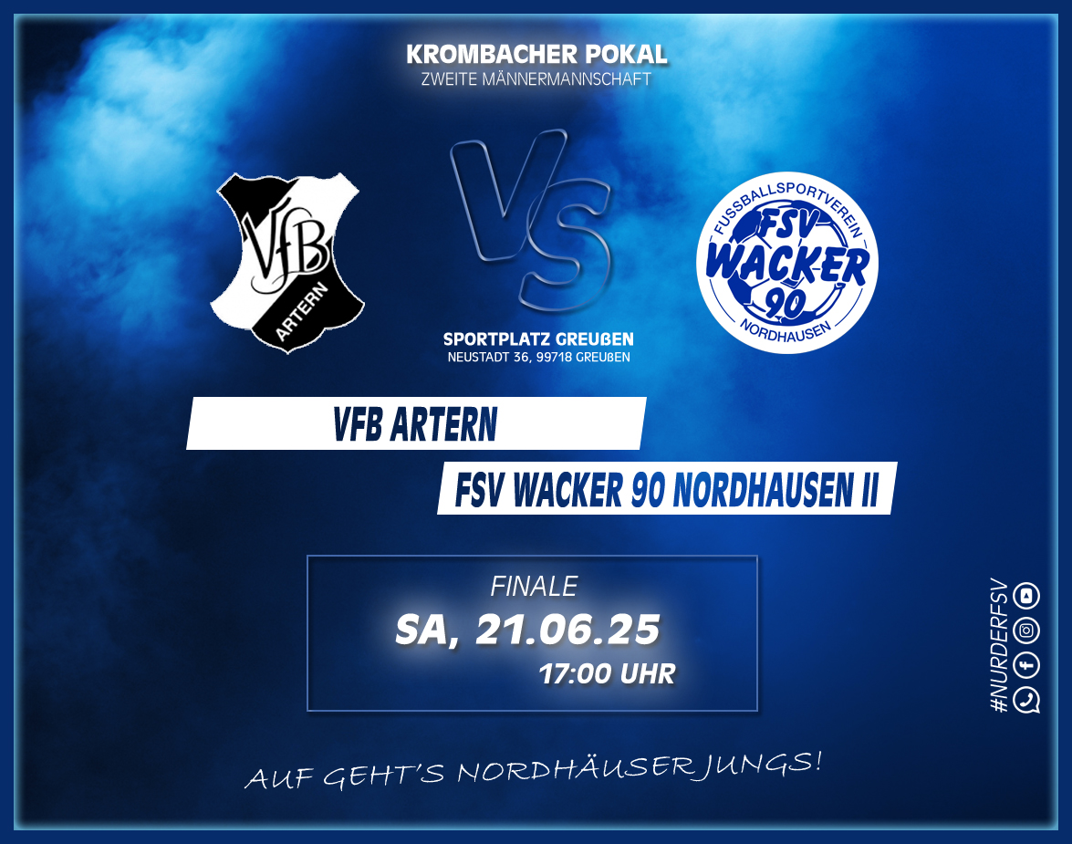 Im Endspiel des Krombacher-Pokals trifft unsere Wacker-Reserve auf Kreisoberligameister VfB Artern. Die Partie wird am Samstag, 21.06.2025 auf den Sportplatz Greußen ausgetragen. Die Anstoßzeit ist um 17:00 Uhr.